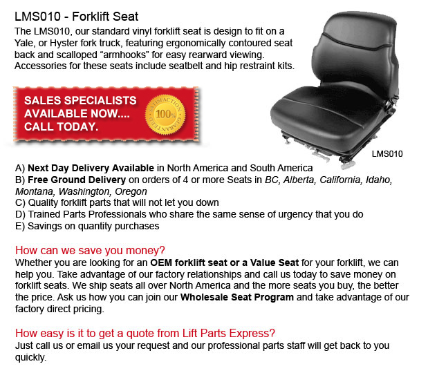TOLL FREE: 1.888-633-0283 seatsforforklifts.com Email Us Lift Parts Express prides itself on the diversity and volume of parts we carry. Regardless of the model of lift truck you run, we have the parts you need. The cost savings we can offer will... More | ||
