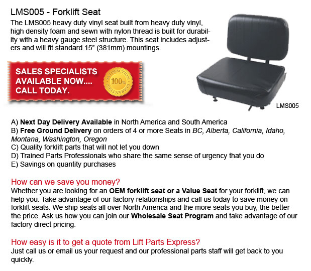 TOLL FREE: 1.888-633-0283 seatsforforklifts.com Email Us Lift Parts Express prides itself on the diversity and volume of parts we carry. Regardless of the model of lift truck you run, we have the parts you need. The cost savings we can offer will... More | ||