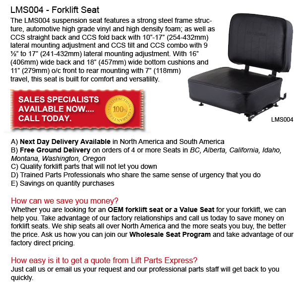 TOLL FREE: 1.888-633-0283 seatsforforklifts.com Email Us Lift Parts Express prides itself on the diversity and volume of parts we carry. Regardless of the model of lift truck you run, we have the parts you need. The cost savings we can offer will... More | ||